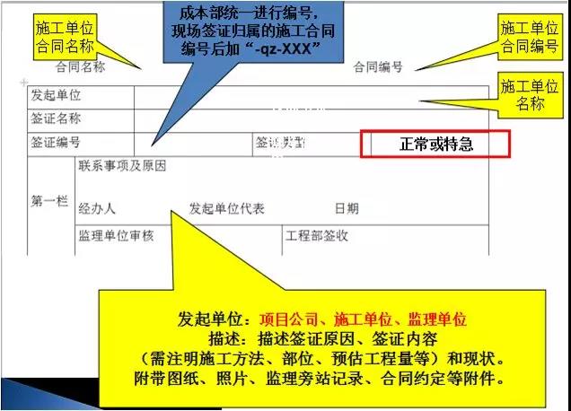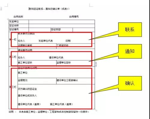 1、發(fā)起單位填寫《現(xiàn)場(chǎng)簽證聯(lián)系、通知及確認(rèn)單》(簡(jiǎn)稱《確認(rèn)單》,第一欄,描述簽證原因、簽證內(nèi)容(需注明施工方法、部位、工程量、工日、造價(jià)等)和現(xiàn)狀。附帶圖紙、照片、監(jiān)理旁站記錄、合同約定等附件。
