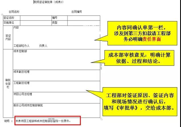 3、工程部對(duì)簽證原因、簽證內(nèi)容和現(xiàn)場(chǎng)情況進(jìn)行審核確認(rèn)后,填寫《確認(rèn)單》第二欄,項(xiàng)目公司代表(工程副總、成本副總)簽發(fā),施工單位簽收?qǐng)?zhí)行。工程部和監(jiān)理單位跟蹤監(jiān)督執(zhí)行。